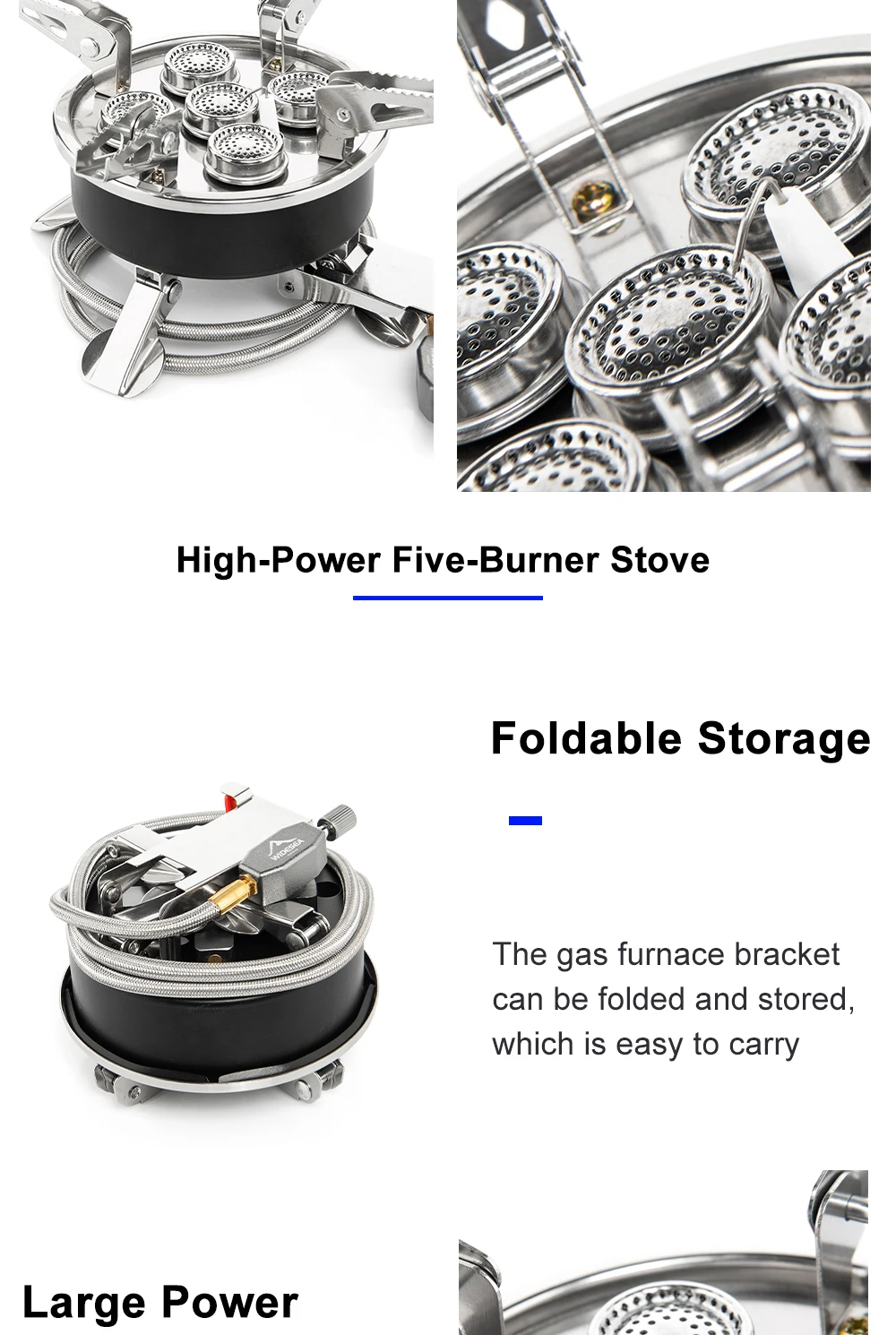 • Salida de alta potencia:Con una potencia de 8800W, Esta estufa de gas es perfecta para acampar y actividades al aire libre, proporcionando un amplio calor y potencia para cocinar y calentar.